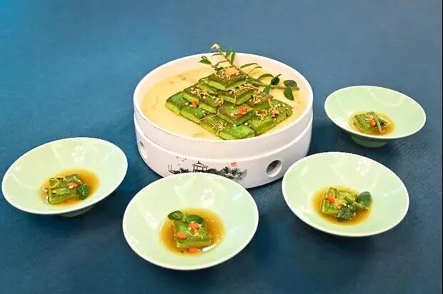 石斛嫩汁豆腐呈菜别具特色,一片片嫩绿的豆腐层层堆叠,在淡黄色的汤汁中静立,对比鲜明的配色将秋日的微寒和躁郁一扫而空。煎过的豆腐外韧里嫩,和着酱汁的鲜香,一口下去唇齿生津,豆香里混合着石斛特有的清香,沁人心脾。