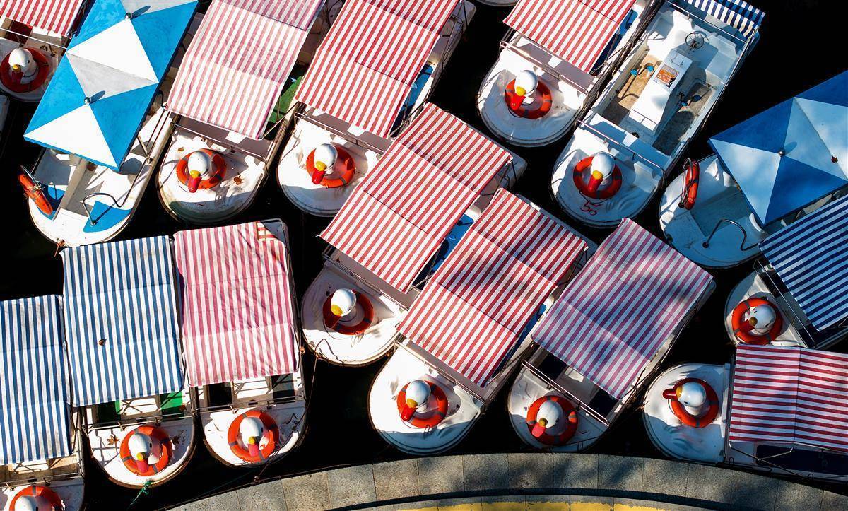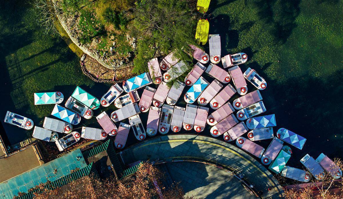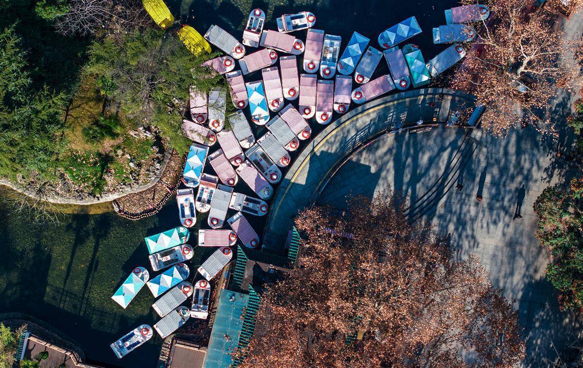 1月9日,鸟瞰武汉中山公园里的游船码头,数十艘船聚集,好像拼方块一样“拼出”一幅美丽图案。